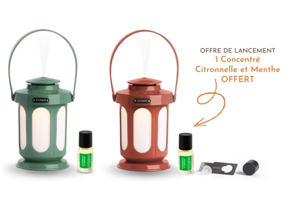 13-03-2026 Diffuseur brume de parfum - édition Lanterne - Terracotta OFFRE DE LANCEMENT : 1 CONCENTRE Citronnelle & Menthe OFFERT inclus NOUVELLE TECHNOLOGIE : Sans eau & Sans fil 2 Ambiances lumineuses : Soft ou Intense Compatible avec tous les concentrés de parfums Estéban Hauteur 15.4 cm - Diamètre 9.1 cm Diffusion et intensité ajustable à la taille des pièces : 25 m2 ; 50 m2 ; 100 m2 Le diffuseur fonctionne uniquement sur batterie (pas sur secteur et ni en cours de chargement) Adaptateur non fourni, uniquement câble USB inclus